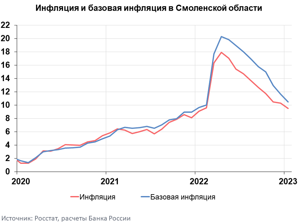 Согласно выводам аналитиков Банка России, годовая инфляция в Смоленской области в январе 2023 года замедлилась по сравнению с декабрём 2022 года на 0,77 процентных пункта, до 9,54 процента, что соответствовало общероссийской тенденции. При этом её значение было ниже, чем в Центральном федеральном округе и по России в целом (12,39 процента и 11,77 процента соответственно). На динамику инфляции в регионе оказали влияние увеличение предложения на отдельных продовольственных и непродовольственных рынках, снижение издержек производителей продуктов питания, сдержанный потребительский спрос на ряд непродовольственных товаров, а также более низкая, чем годом ранее, индексация тарифов на некоторые жилищно-коммунальные услуги.
