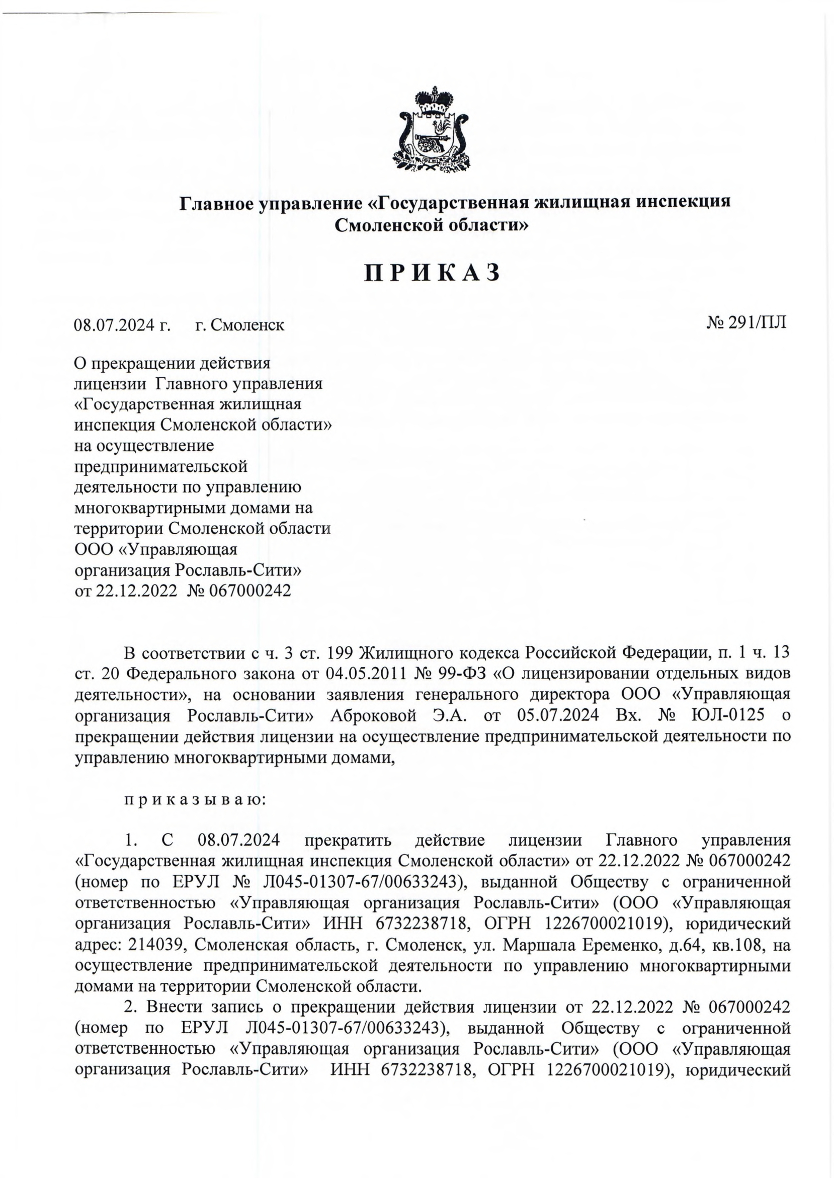 Главным управлением «Государственная жилищная инспекция Смоленской области» принято решение о прекращении с 08.07.2024 действия лицензии Главного управления «Государственная жилищная инспекция Смоленской области» от 22.12.