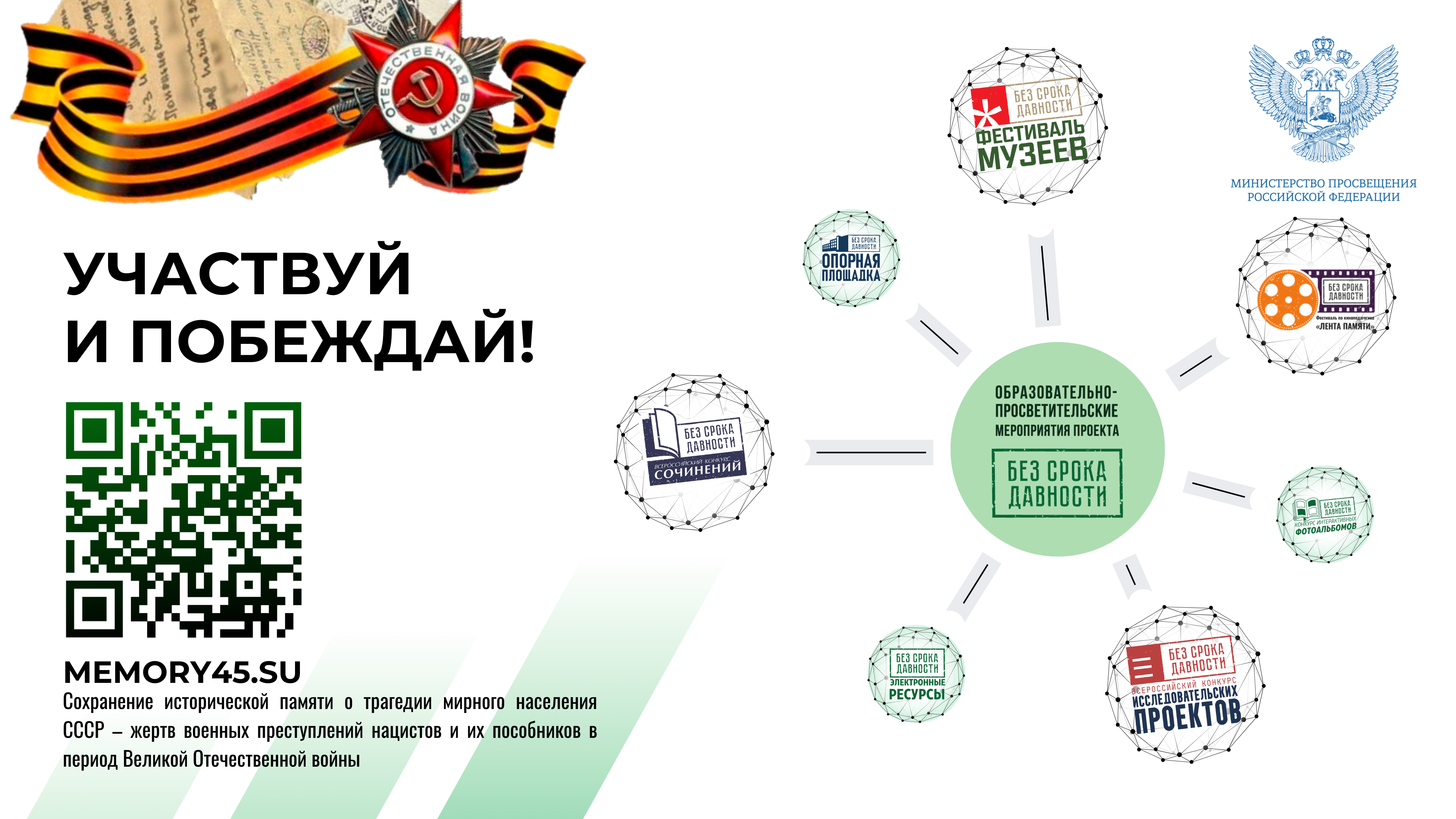 В рамках проекта «Без срока давности» реализуются следующие основные образовательные события: Всероссийский конкурс сочинений, Всероссийский фестиваль музейных экспозиций, Всероссийский конкурс исследовательских проектов, День единых действий.