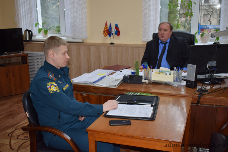 Сегодня в Администрации Глинковского муниципального округа прошла рабочая встреча Главы муниципального образования «Глинковский муниципальный округ» Смоленской области Евгения Владимировича Кожухова с заместителем начальника отдела надзорной деятельности и профилактической работы Дорогобужского, Глинковского и Ельнинского районов управления надзорной деятельности и профилактической работы Главного управления МЧС России по Смоленской области Евгением Геннадьевичем Кученковым. На встрече также присутствовал специалист по ГО и ЧС Администрации округа Алексей Михайлович Буравский.