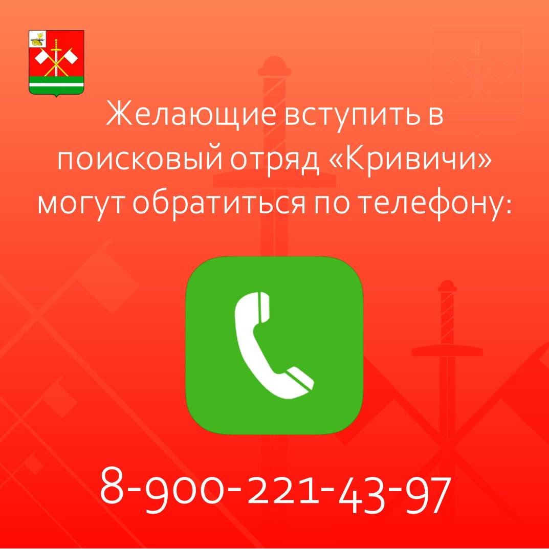 Желающие вступить в поисковый отряд «Кривичи» могут обратиться по телефону: 8-900-221-43-97 .
