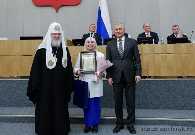 Мэри Стефановна Хохлова - преподаватель дисциплины «Духовные основы христианского милосердия» Смоленского медицинского колледжа. Награду ей вручили Патриарх Московский и всея Руси Кирилл и председатель Государственной Думы Вячеслав Володин.