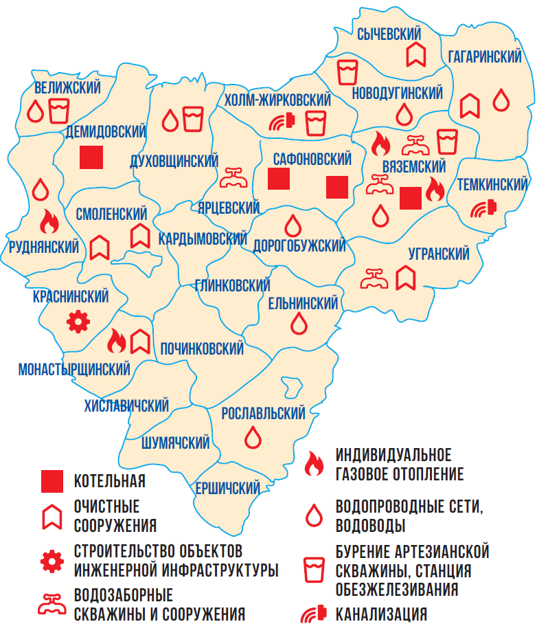 В настоящее время идет строительство очистных сооружений в Монастырщине и Гагарине, строительство сети канализации в Холм-Жирковском. На сайте реготделения «Единой России» показали карту Смоленской области с ЖКХ-проектами Сергея Неверова: