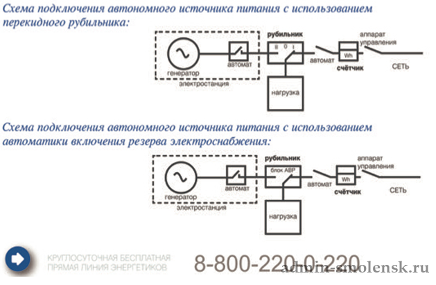 Автономные источники питания (АИП) (бензиновые, дизельные либо газовые генераторы) подключаются при наличии письменного разрешения от сетевой организации на присоединение к электросети. Работы должны проводиться лицом, имеющим право выполнения электромонтажных работ. Необходимым условием для подключения АИП к сети потребителя является наличие между коммутационными аппаратами блокировок, исключающих возможность одновременной подачи напряжения в сеть потребителя и в сеть Россети Центра. Безопасное подключение и эксплуатация автономных источников питания регламентированы «Правилами технической эксплуатации электроустановок потребителей», «Правилами технической эксплуатации электрических станций и сетей РФ».