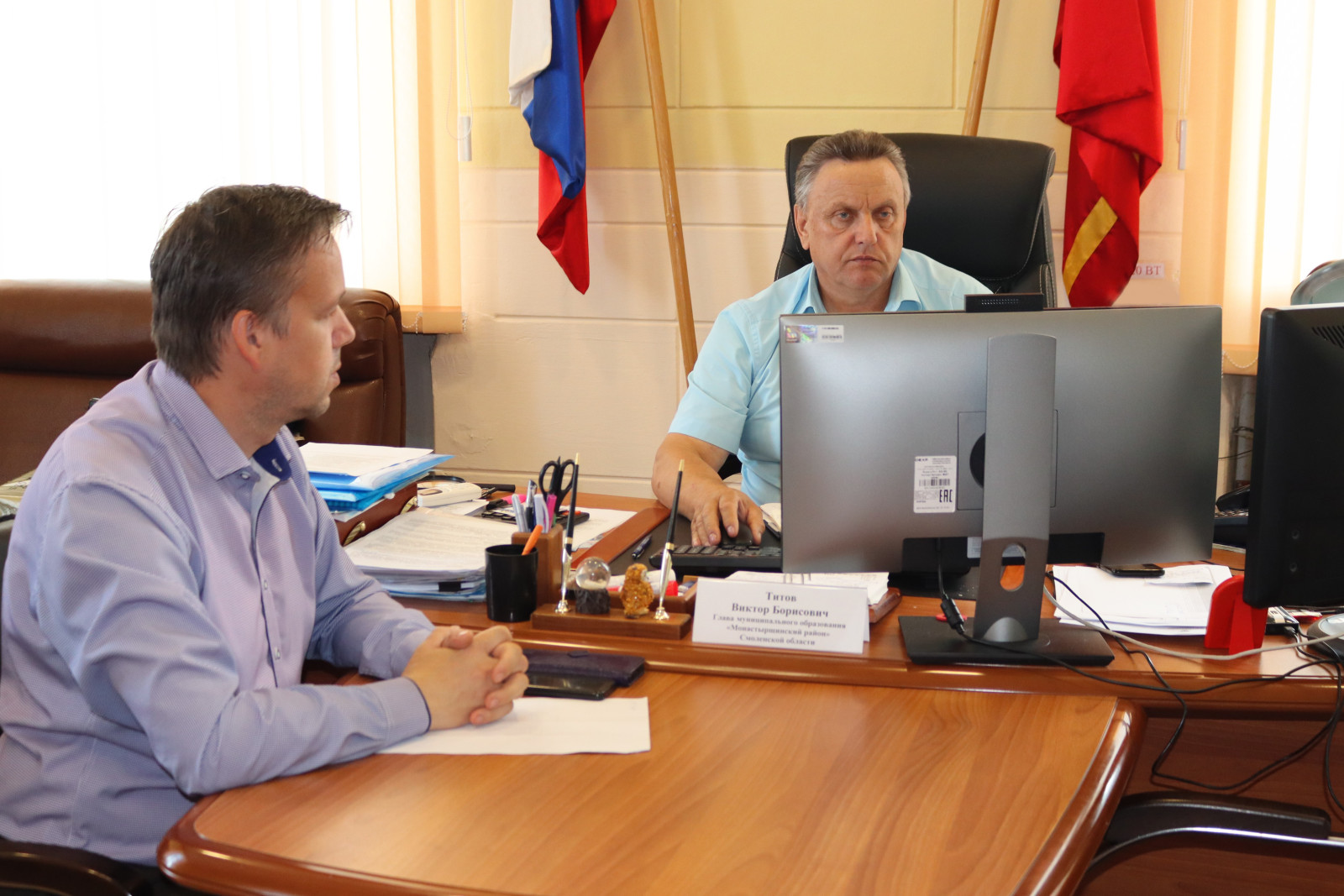 В совещании приняли участие Глава муниципального образования «Монастырщинский район» Смоленской области Виктор Борисович Титов , его заместитель Николай Александрович Дьяконенков .