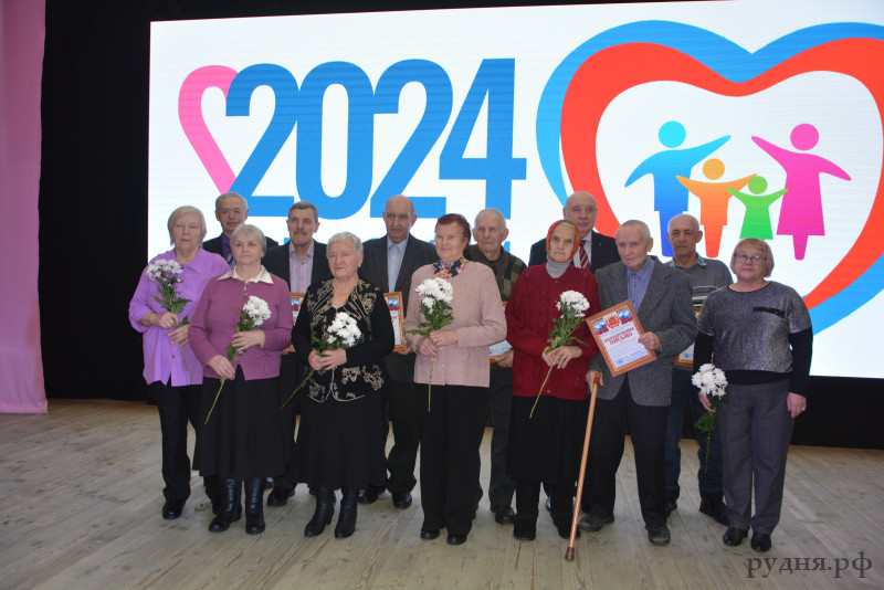 Долгиным Льву Моисеевичу и Светлане Александровне, жителям г. Рудня. Лев Моисеевич работал на МКК в цехе готовой продукции, а в свободное от работы время играл в духовом оркестре на городских и районных мероприятиях. Светлана Александровна долгое время работала в ГДК, затем в Доме творчества, признавалась лучшей по профессии, ее называли любимой «Народной певицей». Стаж их семейной жизни 52 года. У них 2-ве дочери и 3-е внуков.