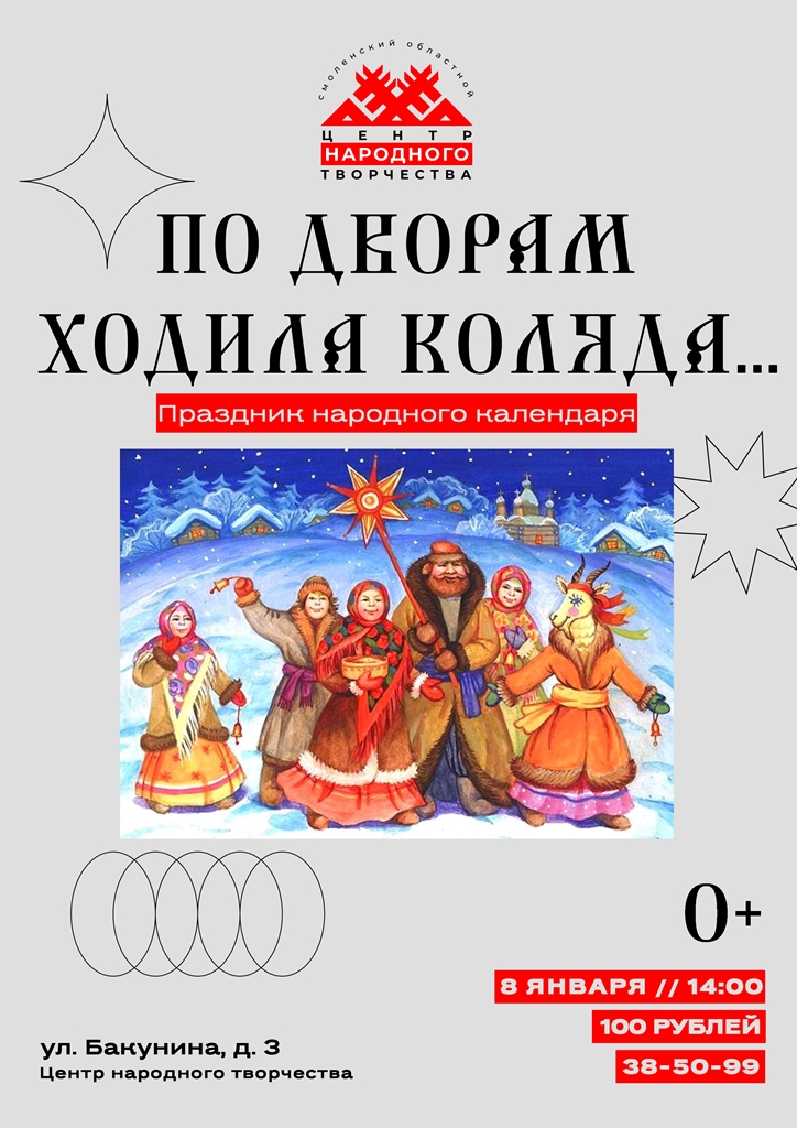 Приглашаем вас на традиционный для многих смолян и ценителей русского народного творчества, праздник народного календаря «По дворам ходила коляда...», который состоится 8 января 2023 года в уютном зале Смоленского областного центра народного творчества.