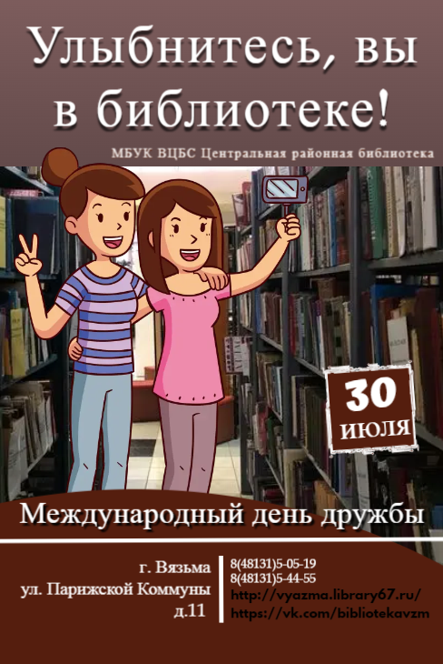 В этот день у всех нас есть отличный повод напомнить своим друзьям о том, насколько они для нас важны. Недаром говорят, что лучше иметь сто друзей, чем сто рублей. Самые богатые на друзей - это библиотеки, их у нас более 23000 человек. И все они очень разные: приходят в библиотеку по одному и компаниями, веселые и серьезные, тихие и шумные. Одни идут за общением, другие почитать журналы и книги, третьи - получить необходимую информацию, поработать на компьютере, четвертые - провести досуг в клубах по интересам, и все они пользуются нашей неизменной любовью и уважением. Какие бы перемены не ожидали нас в будущем, мы знаем, что наши верные читатели, всегда и во все времена будут с нами. Поэтому, мы стараемся сделать так, чтобы всем посещающим наши библиотеки было комфортно и уютно, чтобы люди уходили от нас с радостными и светлыми лицами и прекрасным настроением. Вот и сегодня мы приглашаем всех своих и старых, и новых друзей к нам в гости на фотосессию «Улыбнитесь! Вы в библиотеке!».