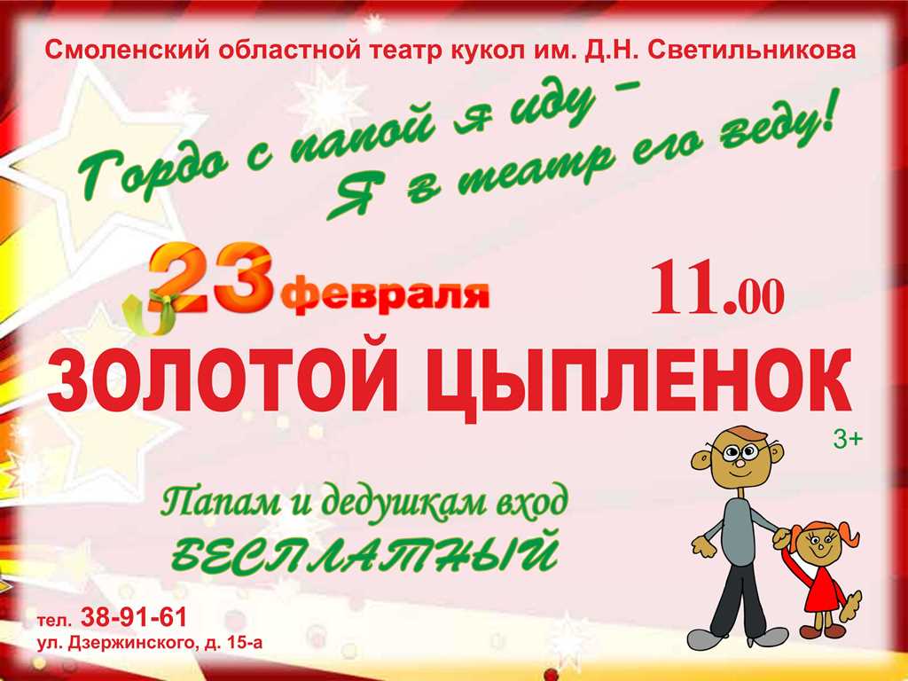 Смоленский театр кукол 23 февраля проводит ставшую уже традиционной акцию «В театр с папой!». Начало в 11.00. В этот день для пап и дедушек вход на спектакль БЕСПЛАТНЫЙ (приобретая один билет для ребенка, второй Вы получаете бесплатно).