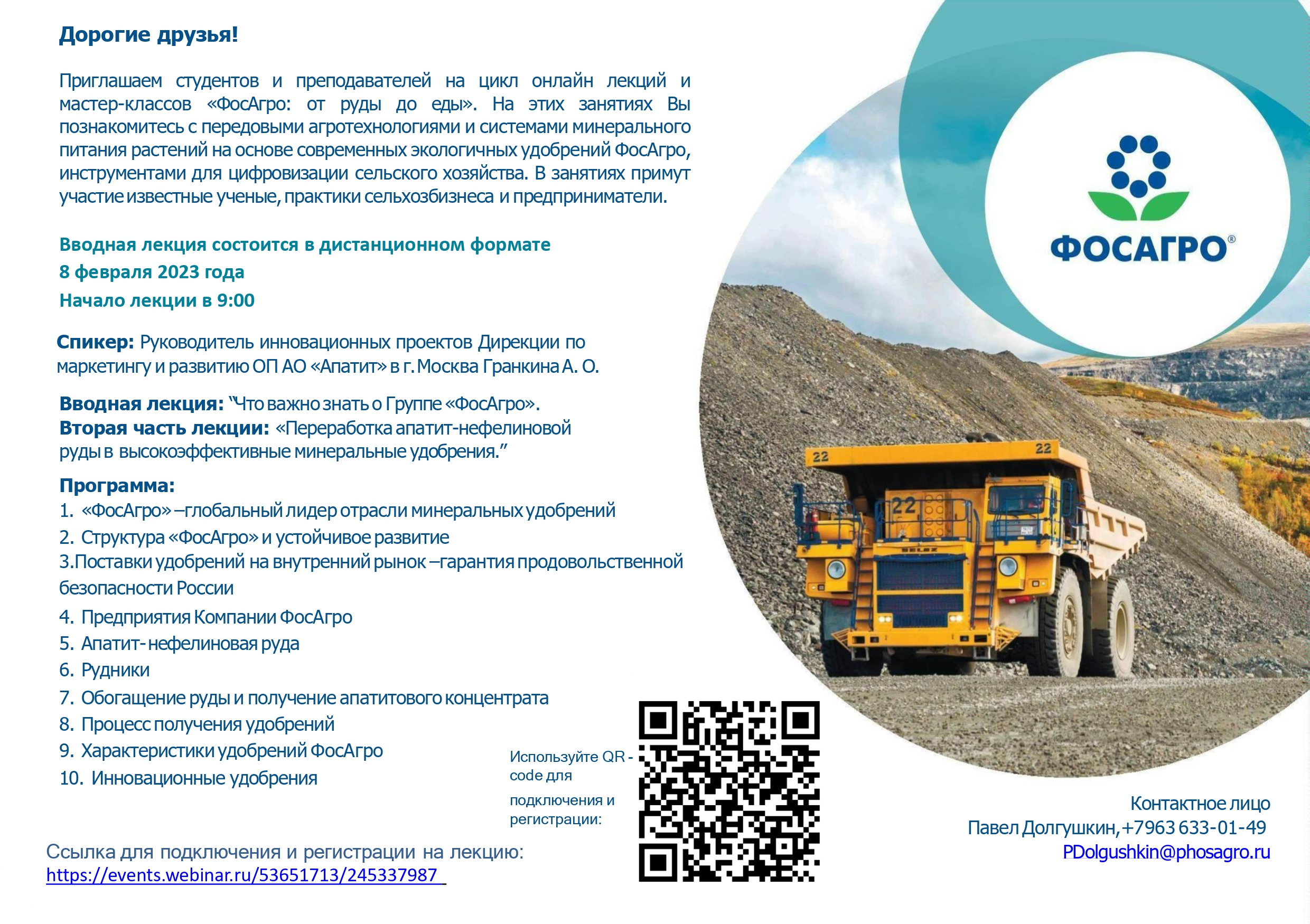 Дорогие друзья! Приглашаем студентов и преподавателей на цикл онлайн лекций и мастер-классов «ФосАгро: от руды до еды».