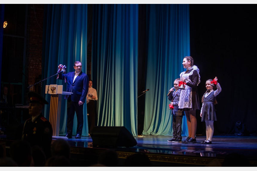 Далее Алексей Островский и вышедшие к трибуне обучающиеся первых классов дали школьный звонок колокольчиками.