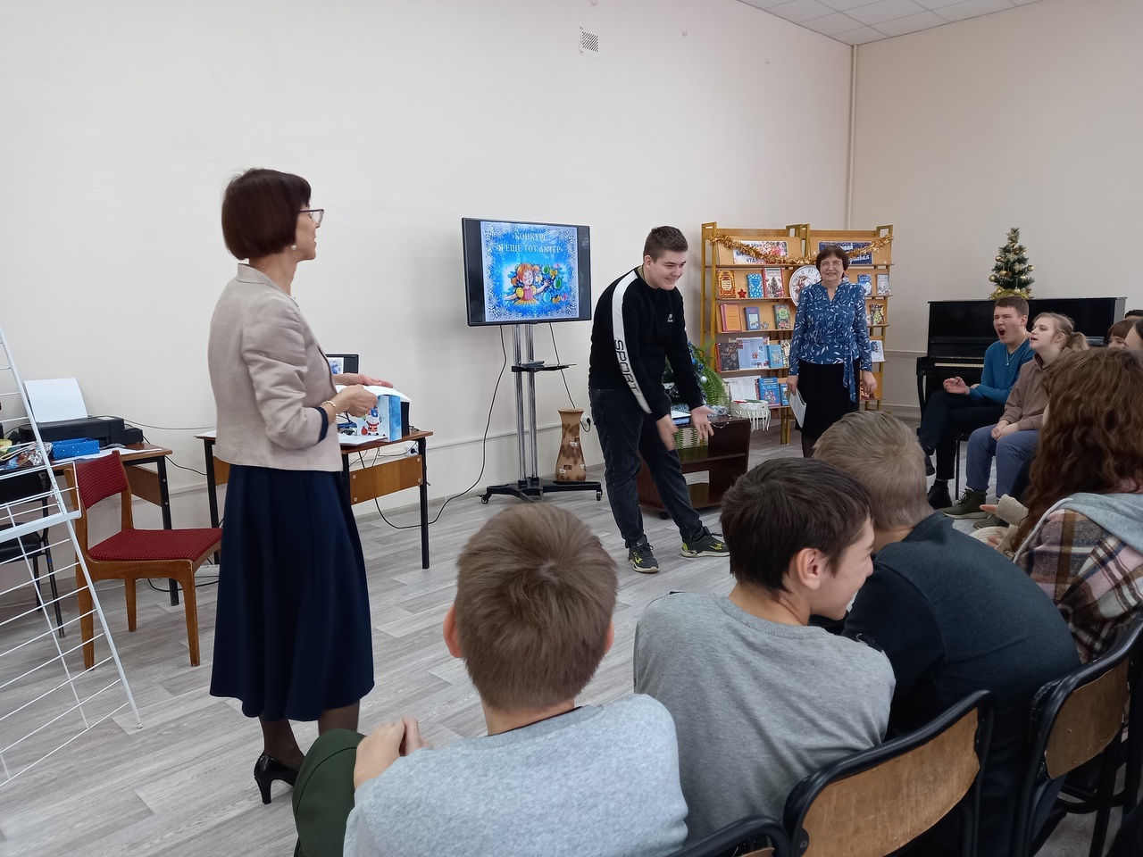 24 декабря в читальном зале центральной библиотеки им. Н.И.Рыленкова для обучающихся МБОУ «Открытая (сменная) школа» прошла предновогодняя конкурсно-игровая программа «Новогодний переполох» с множеством весёлых и озорных конкурсов и игр. Ребятам предложили окунуться в волшебную атмосферу Нового года: вспомнить о традициях и обычаях празднования Нового года во многих странах, узнать интересные факты из истории праздника и вместе с друзьями выполнить веселые задания. Участники угадывали зашифрованные музыкальные композиции и хором исполняли их, нарисовали веселого снеговика с завязанными глазами, дружно отгадывали зимние загадки, участвовали в беспроигрышной новогодней лотерее и узнали о необычных гаданиях на Новый год. Словом, праздничное настроение было создано! Невероятно тепло и светло было от общения с замечательными ребятами.