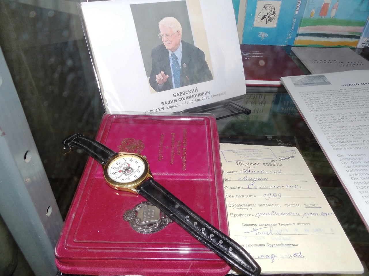 О себе он рассказал в книге «Роман одной жизни». На выставке рядом с книгами – трудовая книжка, знак «Заслуженный деятель науки РФ», часы от главы Смоленска, ноутбук, галстук футбольного болельщика. Эти вещи бережно хранят его ученики вместе с наказом: «Надо делать своё».