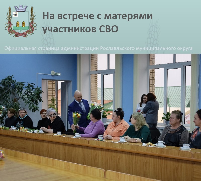 В преддверии 8 марта Глава муниципального образования «Рославльский муниципальный округ» Д.Л. Близученко встретился с матерями участников СВО, погибших при выполнении боевого задания. Дмитрий Леонидович поздравил их с приближающимся Международным женским днем, пожелал мудрости, терпения, благополучия и здоровья. Он выразил искренние слова благодарности за воспитание достойных сыновей. В режиме диалога участники встречи пообщались о коммунальных и хозяйственных вопросах, обсудили предложения по увековечиванию памяти участников специальной военной операции.