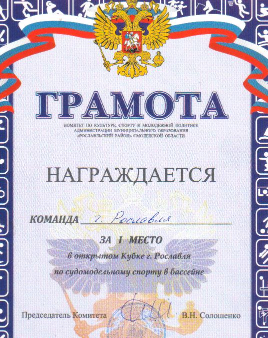 С 28 по 29 января 2023 года в г. Рославль состоялся открытый Кубок г. Рославля по судомодельному спорту. Соревнования проходили в бассейне МБОУ «Средняя школа № 10». Команда судомоделистов МБУДО «ЦДЮТТ» стала одной из четырех команд, принявших участие в этом соревновании, где она и стала победителем, заняла 1 место . В числе участников выступили Прокопов Даниил, Прохоров Михаил, Прохоров Елисей, Ковалев Артём, Ковалев Павел, Кулябин Владислав, Наумов Макар, Антропцев Михаил под руководством педагога дополнительного образования Дудника В.Р. В личном зачете Прохоров Михаил занял 1 место в классе моделей «F 4 В», 1 место в классе моделей «F 4 С», 2 место в классе моделей «F 4 А»; Прокопов Даниил занял 1 место в классе моделей «F 2 A»; Ковалев Артём занял 1 место в классе моделей «Ек-600», 3 место в классе моделей «Ех-600» . Поздравляем победителей!