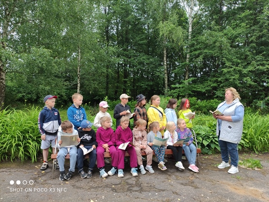 На территории, прилегающей к школе, библиотекарь провела беседу с детьми, затронув тему природы. Познакомила ребят с творчеством русских поэтов: А.С.Пушкина, М.Ю. Лермонтова, Ф.И. Тютчева, А.К. Толстого,