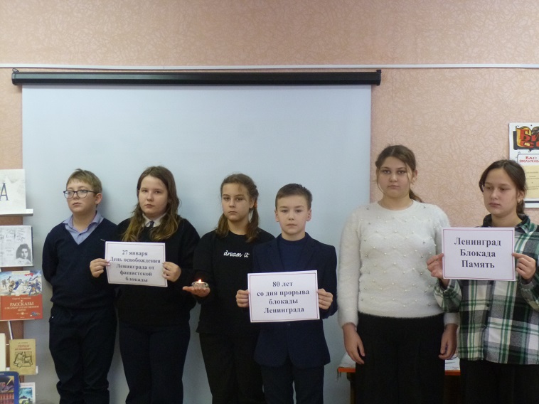 Библиотекарь рассказала ребятам о тяжёлых испытаниях, выпавших на долю жителей осаждённого закрытого города Ленинграда: о голоде и холоде, о детях и женщинах, работавших наравне с мужчинами на заводах, о защите и обороне города советскими солдатами. Особенной страницей стала история судьбы маленькой девочки Тани Савичевой. Её дневник стал одним из символов Великой Отечественной войны.