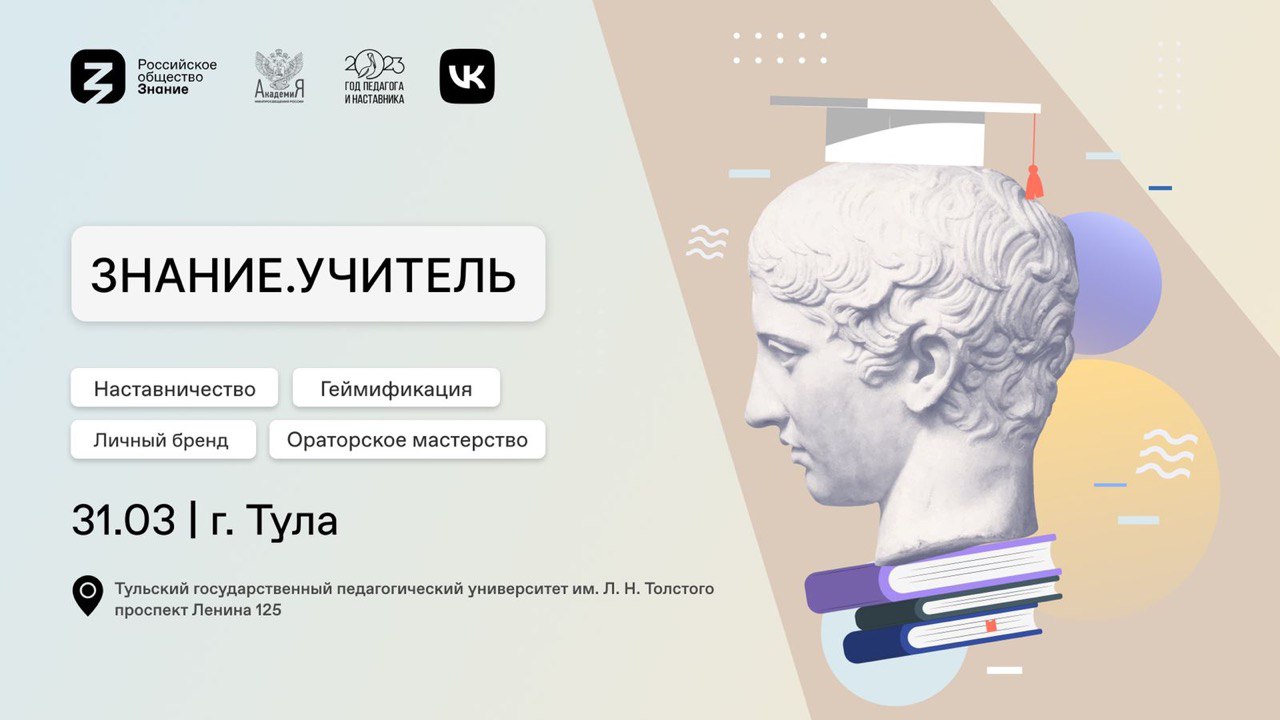 31 марта в Тульском государственном педагогическом университете им. Л.Н. Толстого в рамках Года педагога и наставника пройдёт форум для будущих педагогов Знание.Учитель. Его организатором выступает Российское общество «Знание» совместно с Академией Минпросвещения России и компанией VK. Участниками мероприятия станут более ста студентов. Программа форума затронет вызовы современности и возможности, которые открываются для преподавателей в XXI веке.