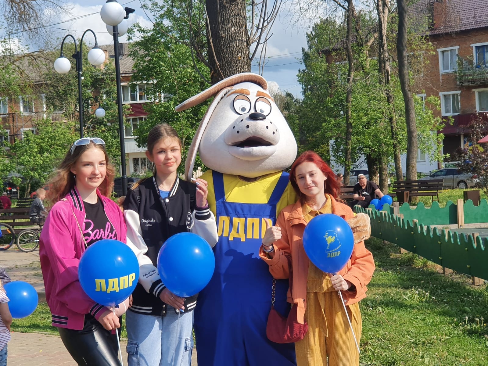 Активисты ЛДПР вместе с Натальей Тригубко порадовали детей воздушными шариками, мороженым и фотографиями с ростовой куклой собачки ЛДПР.