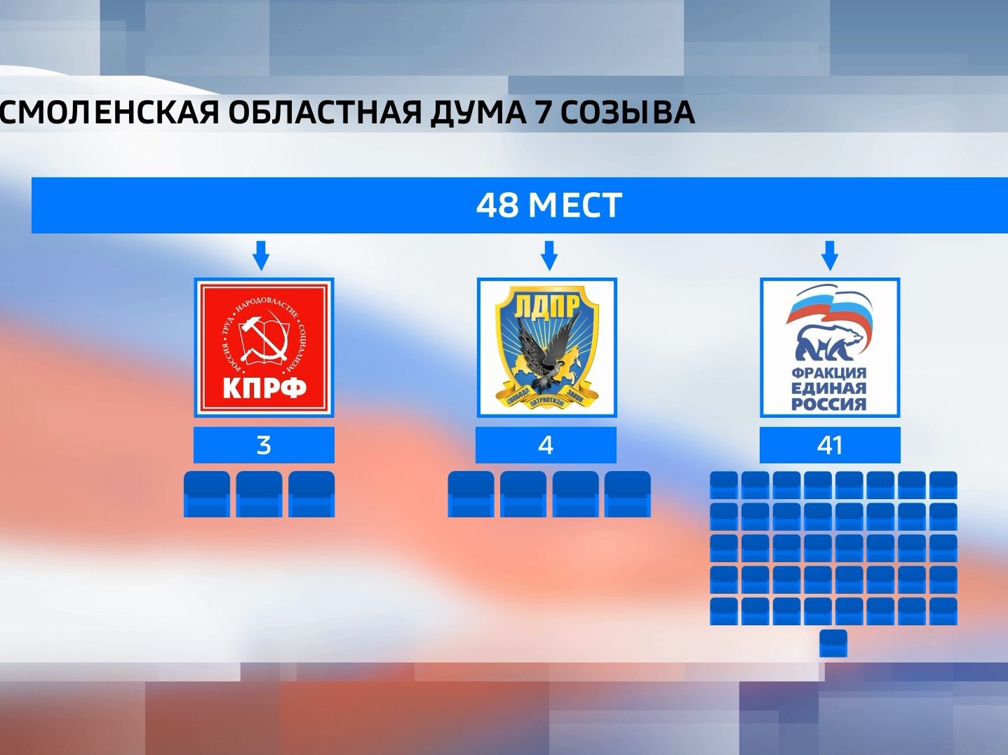 Смоленская областная дума седьмого созыва стала трёхпартийной. Причем с существенным усилением роли «Единой России». Она получила 41 место из 48. Еще четыре мандата у ЛДПР и три – у КПРФ. Для сравнения, в прошлом составе у «единороссов» было всего 26 мест, а помимо ЛДПР и КПРФ, имевших большее представительство, в парламенте также находились по два депутата от «Партии пенсионеров» и «Справедливой России – За Правду». В этот раз им не удалось преодолеть пятипроцентный барьер.