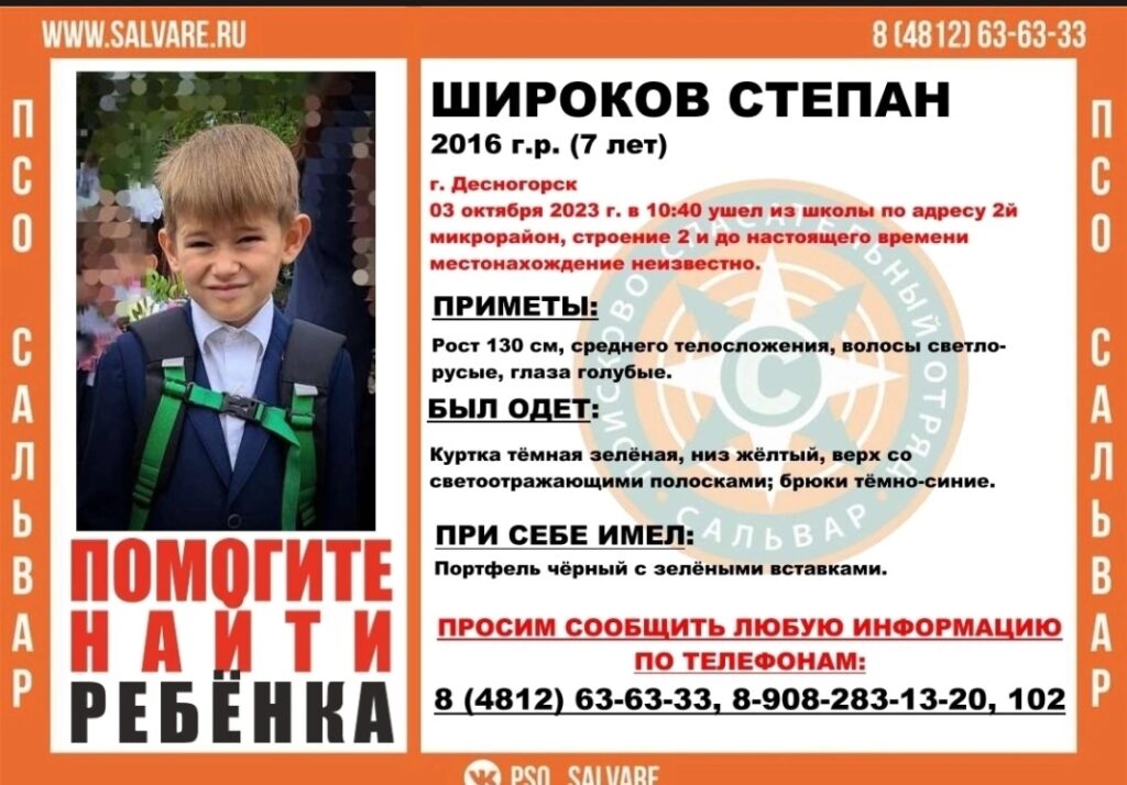 В Десногорске 3 октября пропал 7-летний ребёнок. Степан Широков в 10:40 ушел из школы во 2-м микрорайоне, но домой до сих пор не вернулся, сообщает ПСО «Сальвар».