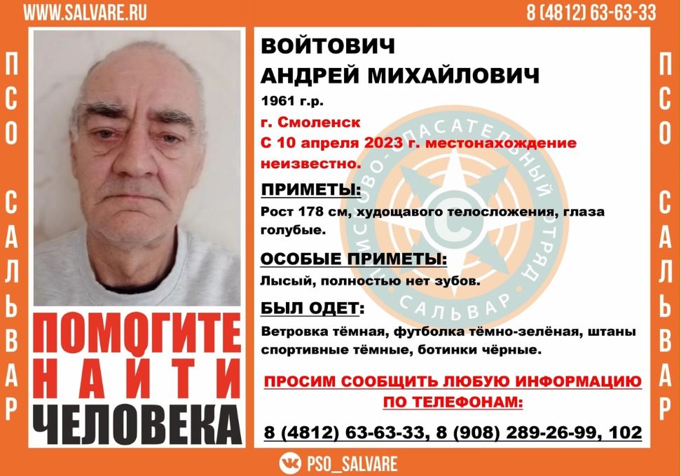 В Смоленске две недели ищут пропавшего 62-летнего мужчину без зубов.