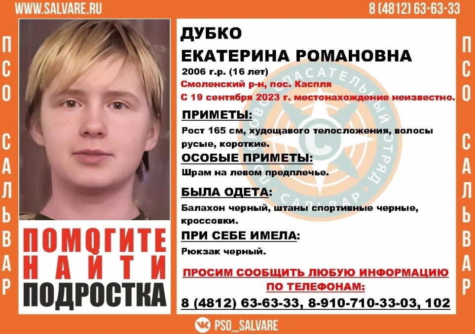 В Смоленской области пропала 16-летняя Екатерина Дубко.