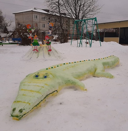 В снежном городке расположился сказочный Осьминог, приготовив для ребят «препятствия», через которые можно прыгать (2 младшая группа, воспитатели Ю.А. Шавалдина, А.В. Гасич). А на участке 1 младшей группы (воспитатели Т.Б. Соколова, А.В. Голик) ребят встречает веселая Гусеница, яркая и необычная.
