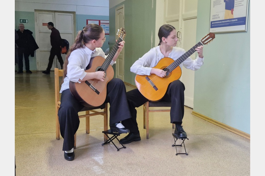 Гитарный дуэт Детской музыкальной школы № 5 имени В.П. Дубровского Софьи Кузьминой и Анны Измайлович, преподают музыку которым Елена Синицына и Ольга Чекалина, приняли участие в благотворительном концерте «Крещенские встречи».