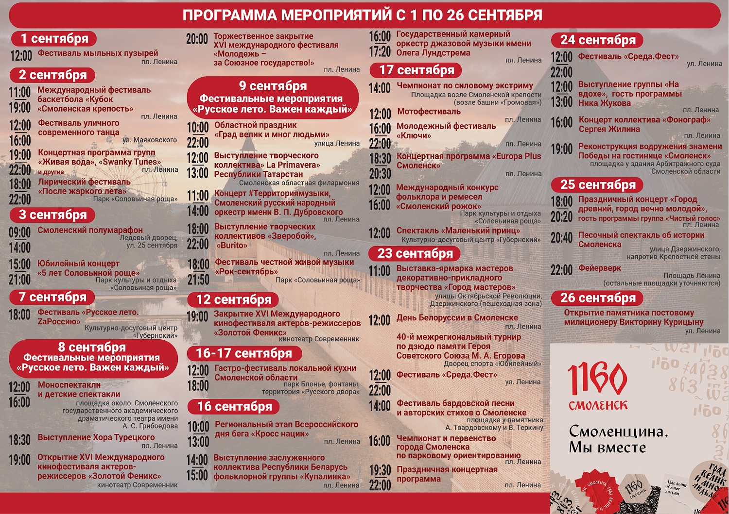 В мероприятиях юбилейного сентября жители и гости Смоленска точно найдут занятие по душе. Среди событий – международный фестиваль баскетбола и полумарафон, моноспектакли и реконструкция водружения знамени Победы, а также множество концертных программ.