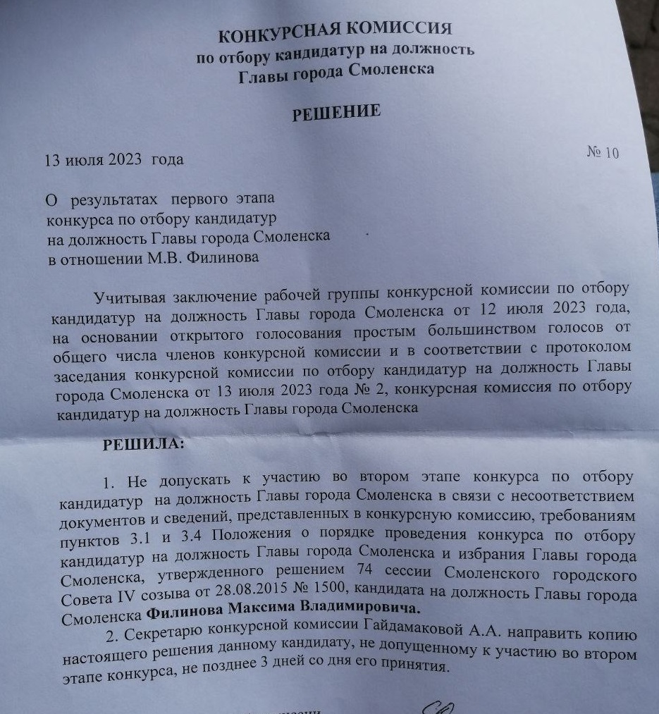 Филинова не допустили к участию во втором этапе конкурса по отбору кандидатур на должность главы города Смоленска.