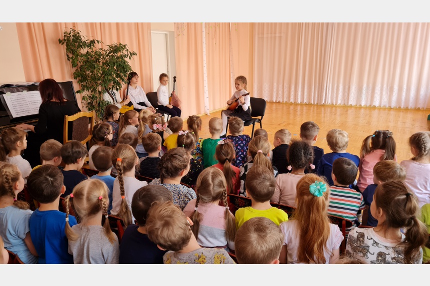 Учащиеся Детской музыкальной школы № 5 им. В.П. Дубровского сделали подарок воспитанникам детского сада «Колокольчик» – концерт под названием «С чего начинается Родина», посвященный Дню защитника Отечества.