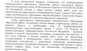 «Представитель Администрации муниципального образования «Ярцевский район» Смоленской области вызван в прокуратуру района для решения вопроса о возбуждении дела об административном правонарушении, предусмотренном частью 1 статьи 7.29 Кодекса об административных правонарушениях Российской Федерации — принятие решения о способе определения поставщика (подрядчика, исполнителя) , в том числе решения о закупке товара, работ, услуг для обеспечения государственных и муниципальных нужд у единственного поставщика (подрядчика, исполнителя), с нарушением требований, установленных законодательством Российской Федерации о контрактной системе в сфере закупке товаров, работ, услуг для обеспечения государственных и муниципальных нужд», — говорится в документе.