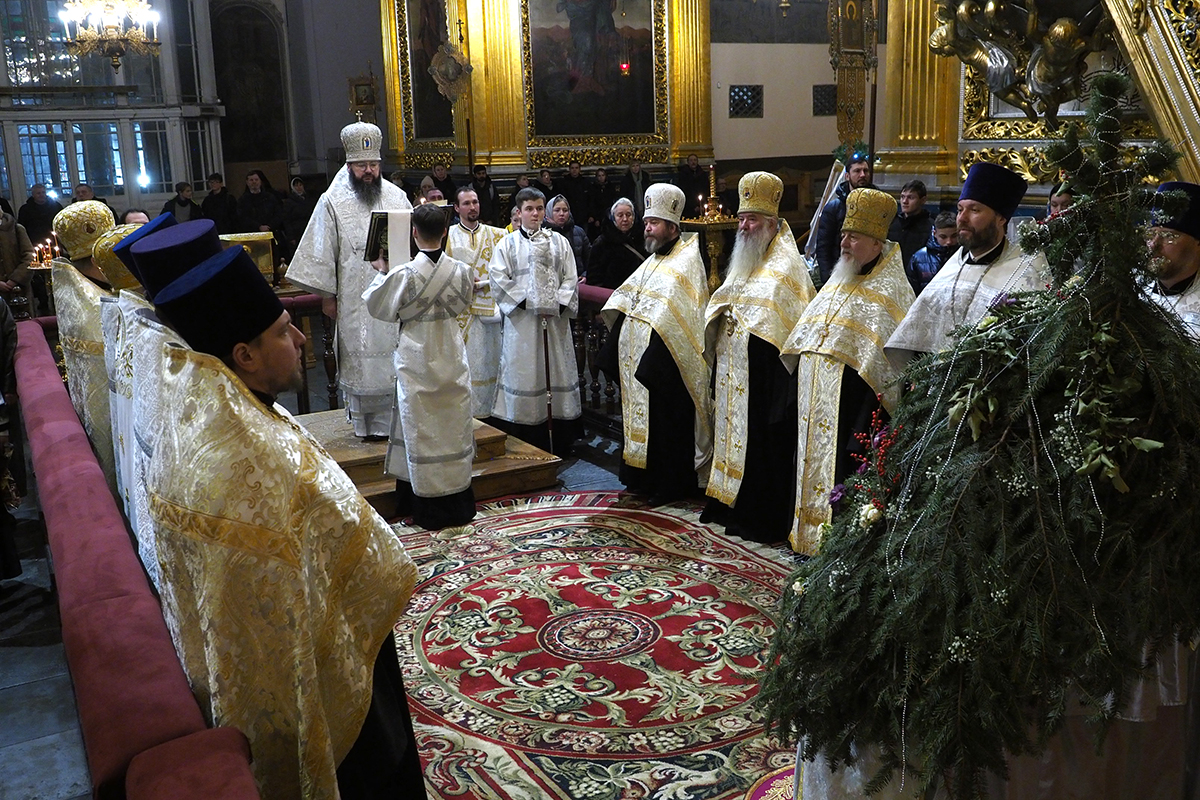 За Великой вечерней молились клирики, игумены, игумении и монашествующие монастырей епархии, представители православных образовательных организаций, сотрудники Смоленского епархиального управления, прихожане Успенского собора и других смоленских храмов, пришедшие в кафедральный храм поздравить смоленского архипастыря с светлым праздником Рождества Христова.