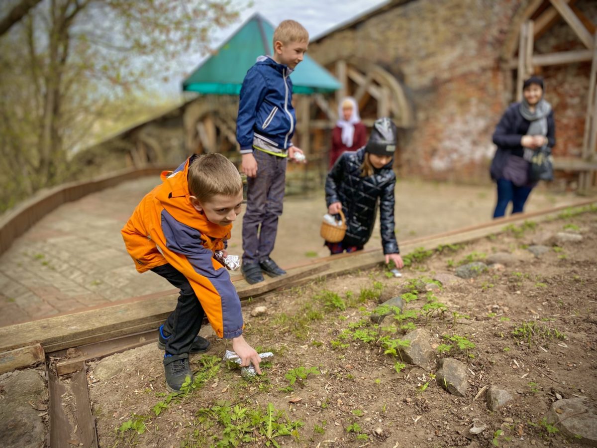 Участники квеста отвечали на вопросы викторины о событиях Воскресения Христова, а затем искали сладкий клад по пошаговым подсказкам, спрятанным в разных местах на территории храма.