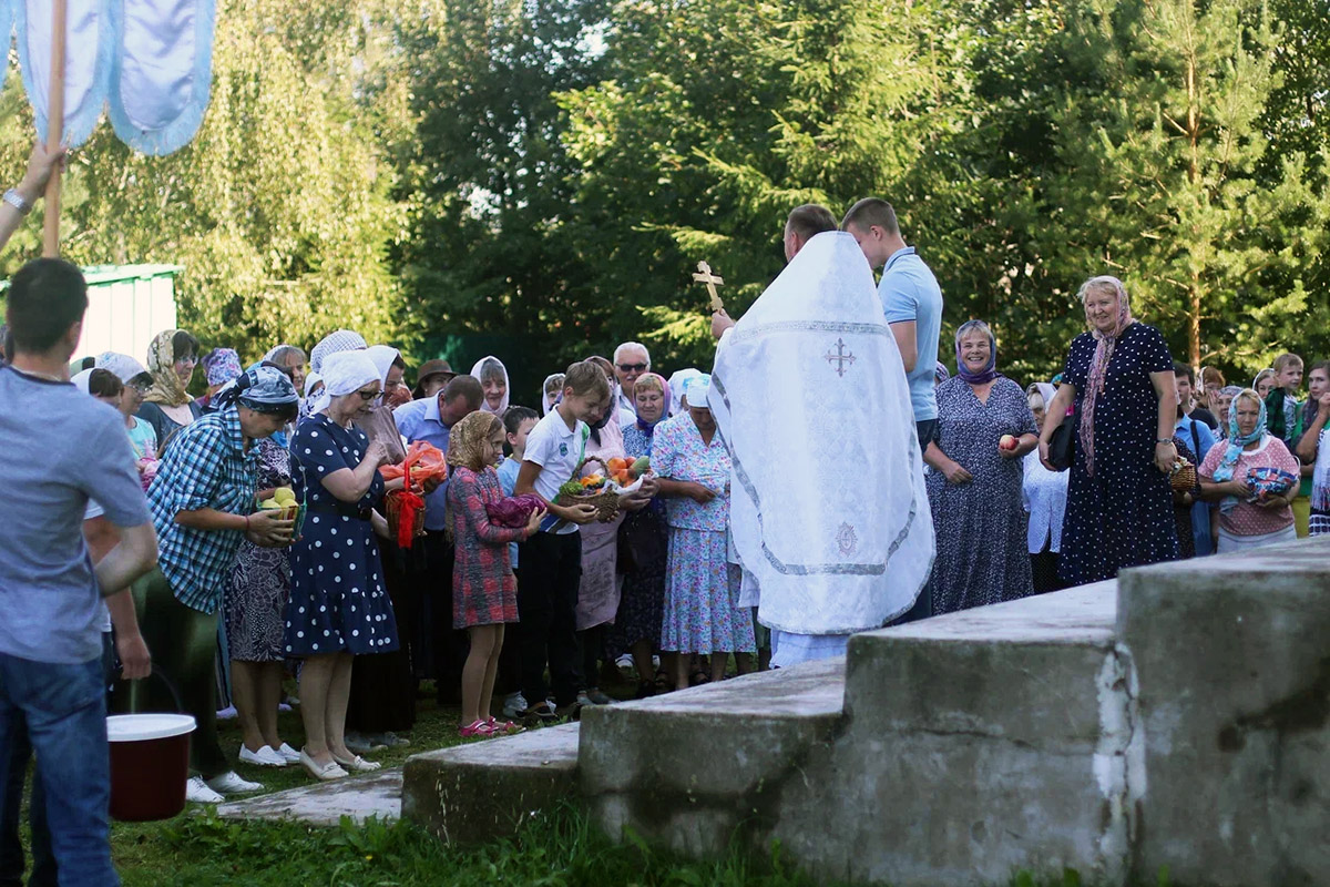 Благочинный Демидовского церковного округа протоиерей Александр Миронов поздравил всех пришедших с праздником и рассказал, что праздники, которые в народе называют Медовый, Яблочный и Ореховый Спасы основаны на праздниках Православной Церкви.