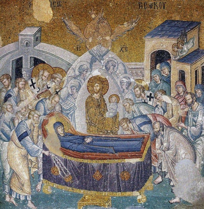 Перед кончиной Пресвятая Дева Мария хотела увидеть всех апостолов, которые к тому времени разошлись по разным местам проповедовать христианскую веру. Несмотря на это, желание Богородицы исполнилось: Святой Дух чудесным образом собрал апостолов у ложа Пресвятой Богородицы, на котором Она молилась и ожидала Своей кончины. Сам Спаситель в окружении ангелов сошел к Ней, чтобы забрать Ее душу с Собой.