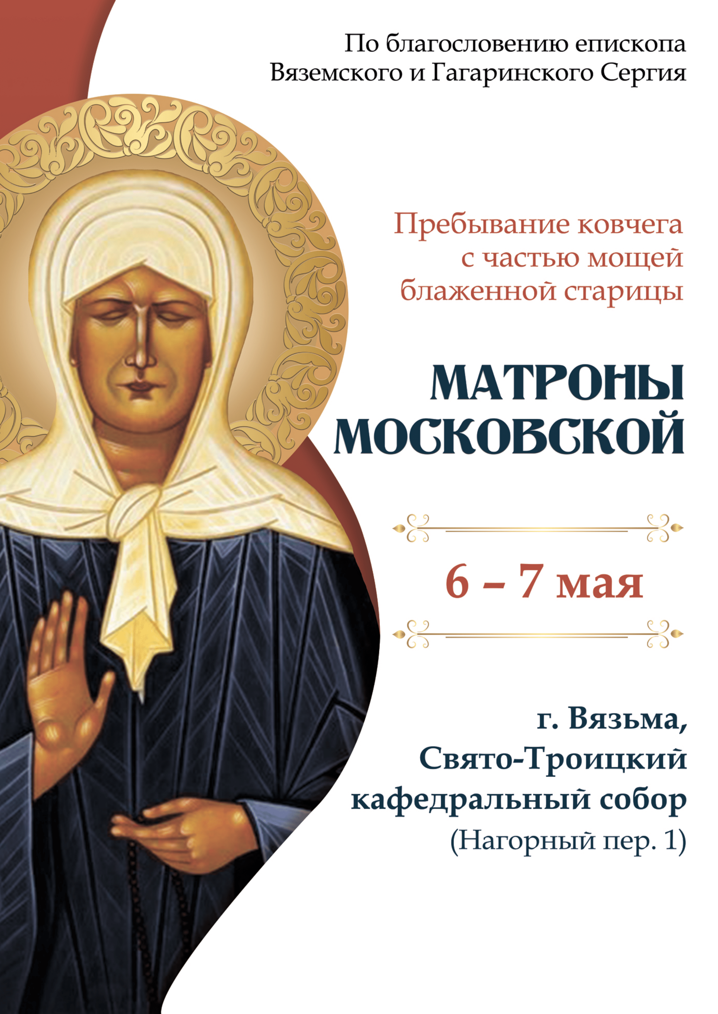 С 6 по 7 мая в Свято-Троицком кафедральном соборе г. Вязьмы по благословению епископа Вяземского и Гагаринского Сергия будет пребывать ковчег с частью мощей блаженной старицы Матроны Московской.