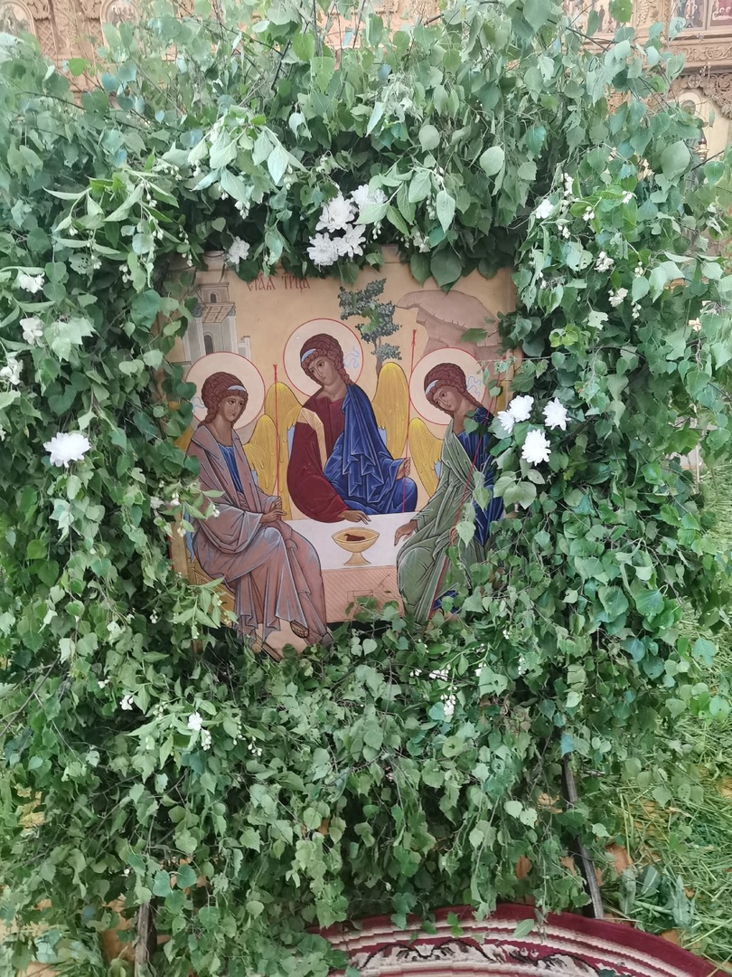 По древней традиции храм был украшен ветвями деревьев, верующие за всенощной также держали в руках зеленые ветви и цветы.