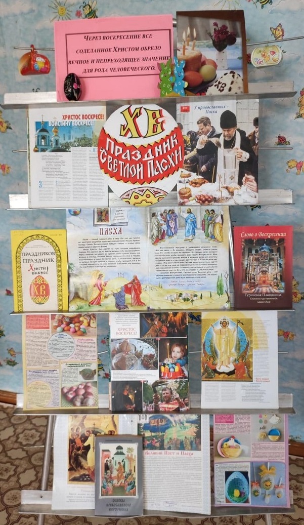 На выставке представлена православная литература и статьи из журналов, посвященные Пасхе, ее истории, ее значимости в жизни православных людей,
