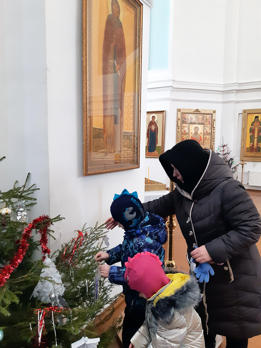 Благочинный Демидовского округа протоиерей Александр Миронов рассказал собравшимся о празднике Рождества Христова, его традициях и символах. Все вместе пропели Рождественскую колядку и молитву Ангелу Хранителю. Затем все присутствующие разместили принесенные творческие работы на елях и праздничных столах в соборе. Также в украшении собора были представлены работы Смоленской православной гимназии. Ребята вложили в свои работы много тепла, доброты и радости. Их игрушки создают рождественское настроение и вызывают восхищение детской фантазией.