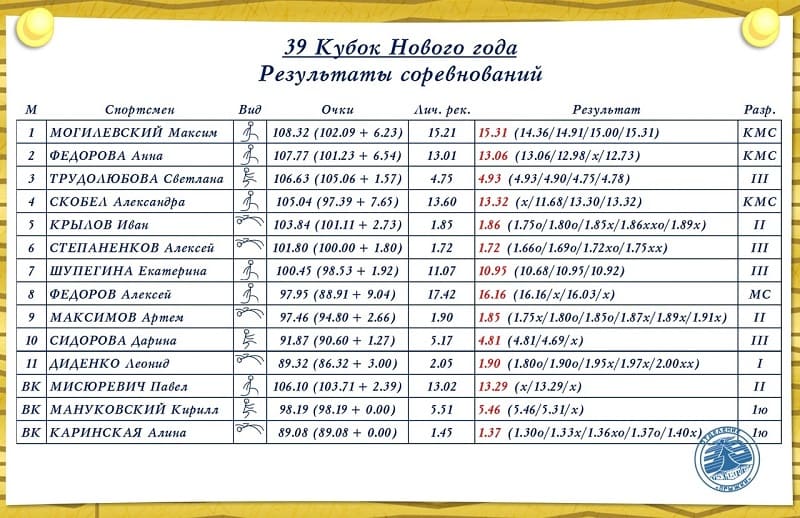 Традиционные соревнования по легкоатлетическим прыжкам состоялись в СШОР имени Михеенко 31 декабря. Напомним, что турнир от других отличает сложная формула определения победителя.