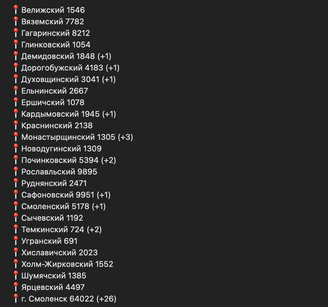 Как уточнили в ведомстве, в этот раз ковид «атаковал» 10 смоленских муниципалитетов. Таким образом, прирост по районам выглядит так: