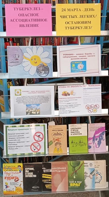 С целью привлечения внимания к этой проблеме и с целью профилактики туберкулёза, в преддверии Всемирного дня борьбы с туберкулезом, в Алексинской сельской библиотеке была оформлена книжно-иллюстрированная выставка «Туберкулез – опасное ассоциативное явление» . Представленная на выставке литература знакомит с этим коварным заболеванием и профилактическими мерами.