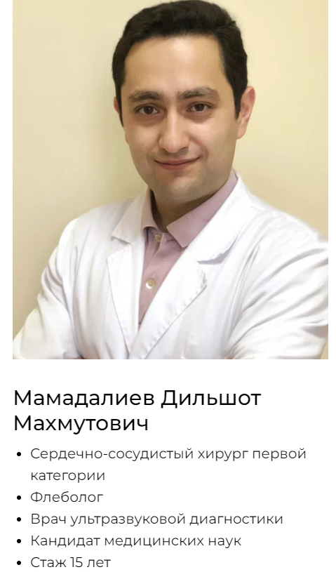 Дильшот Мамадалиев – кандидат медицинских наук – работает сердечно-сосудистым хирургом, флебологом.