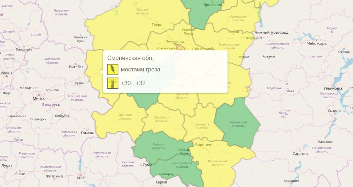 В Смоленской области сегодня, 29 июня, объявили «жёлтый» уровень погодной опасности из-за грозы о очень высокой температуры воздуха, сообщается на сайте Гидрометцентра России.