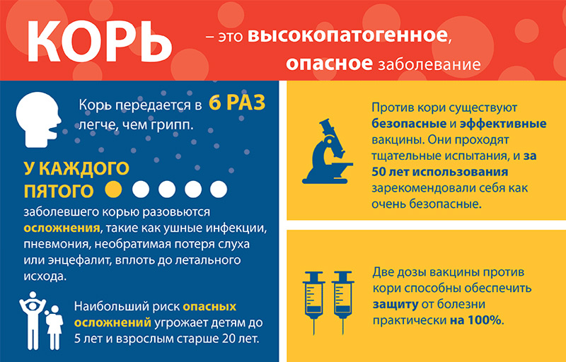 В группе риска – невакцинированные дети в возрасте до 5 лет. Дети более старшего возраста переносят корь легче.