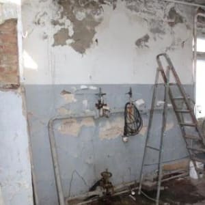 Встроенное помещение, 2-х этажное, фундамент железобетонный, стены кирпичные, крыша мягкая рулонная совмещенная с перекрытием, полы бетонные, ворота и окна деревянные.